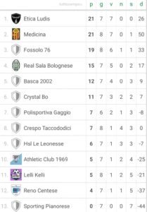 La classifica della ETICA PRIMA SQUADRA alla sosta del girone di andata